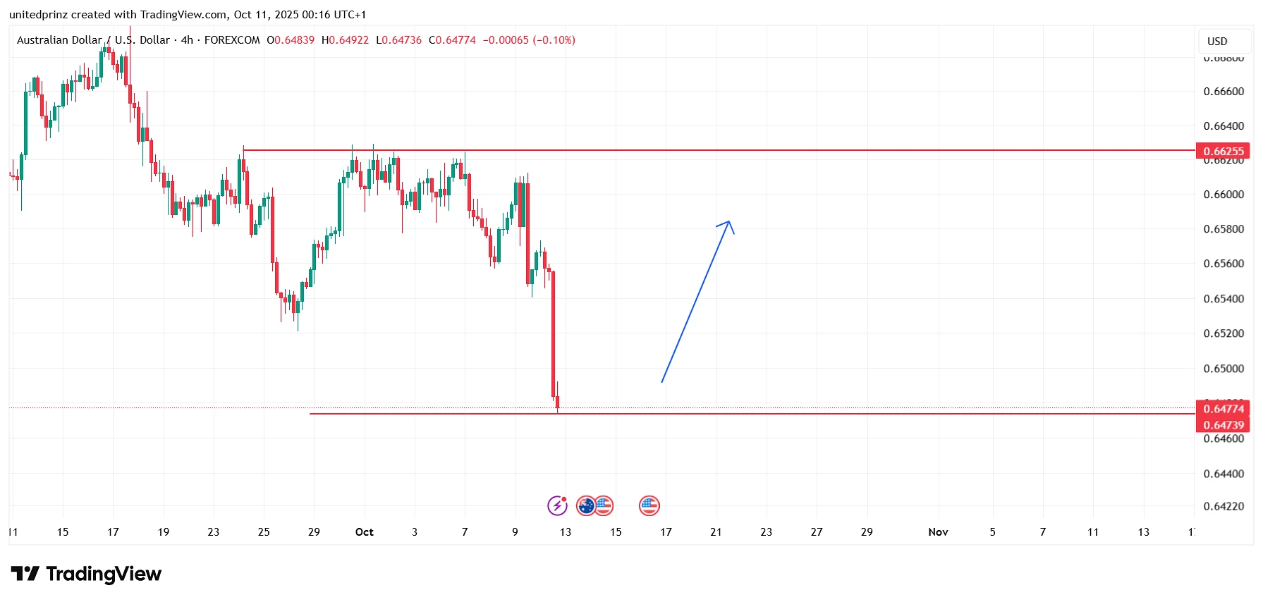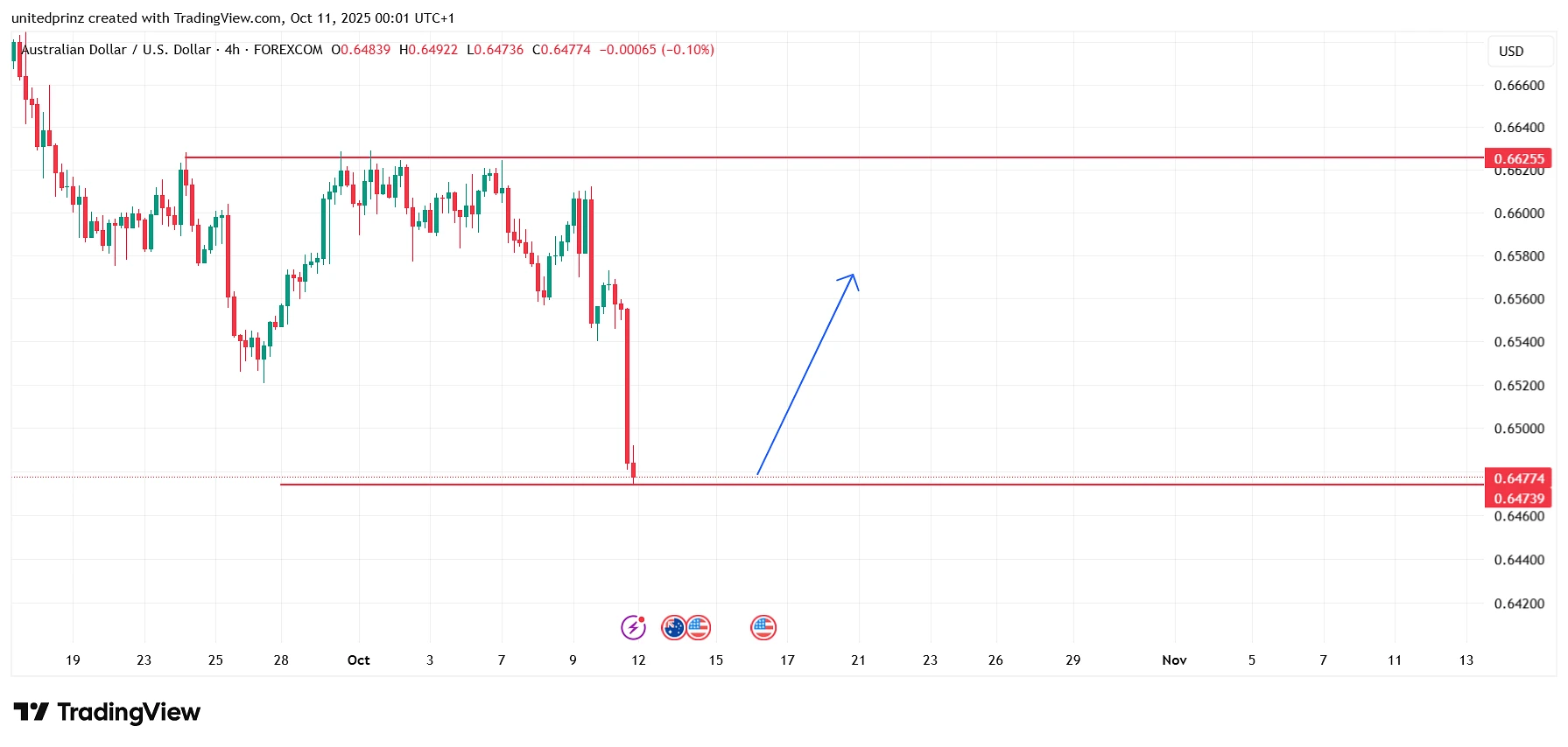 AUD/USD trading at 0.6484, support at 0.6450–0.6470, resistance 0.6590–0.6625.