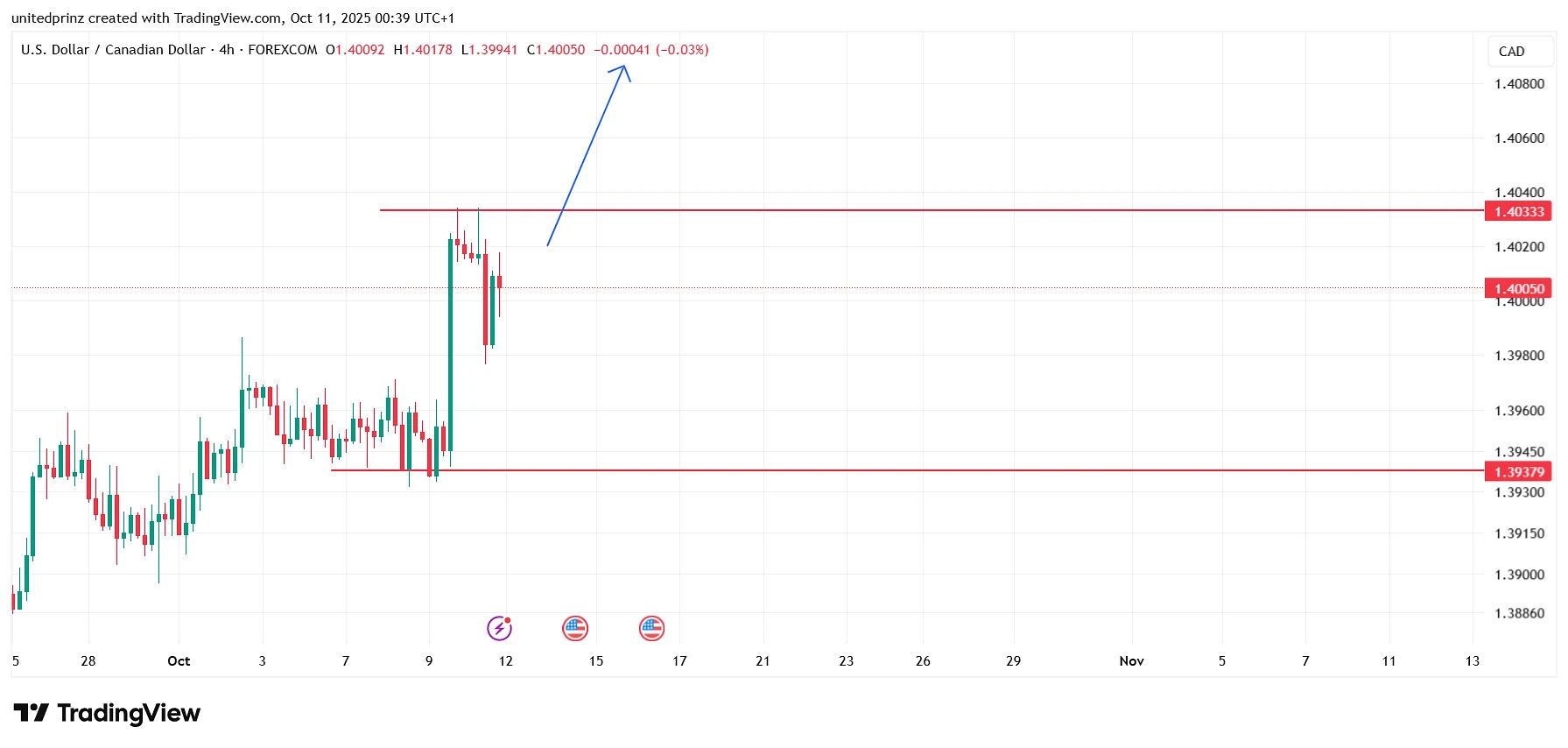 USD/CAD trading at 1.4015, testing 1.4000, support 1.3960–1.3965, resistance 1.4030–1.4060.
