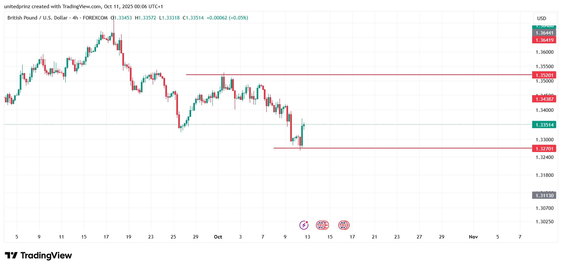 GBP/USD testing support 1.3250–1.3280, resistance 1.3490–1.3520.