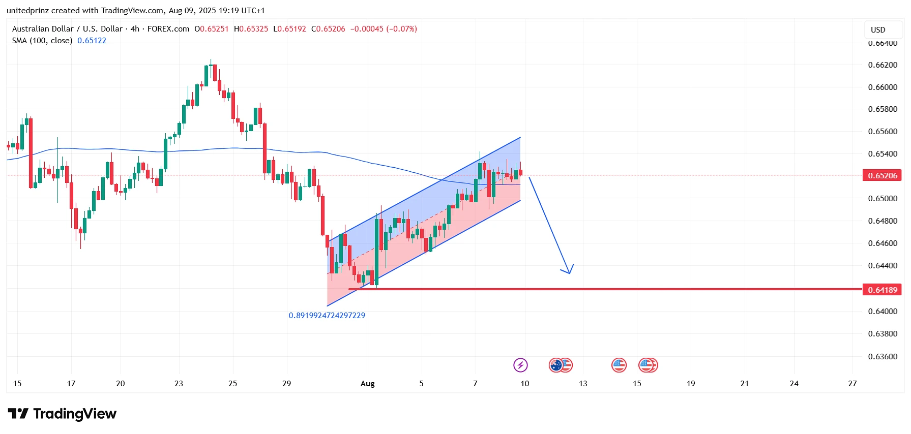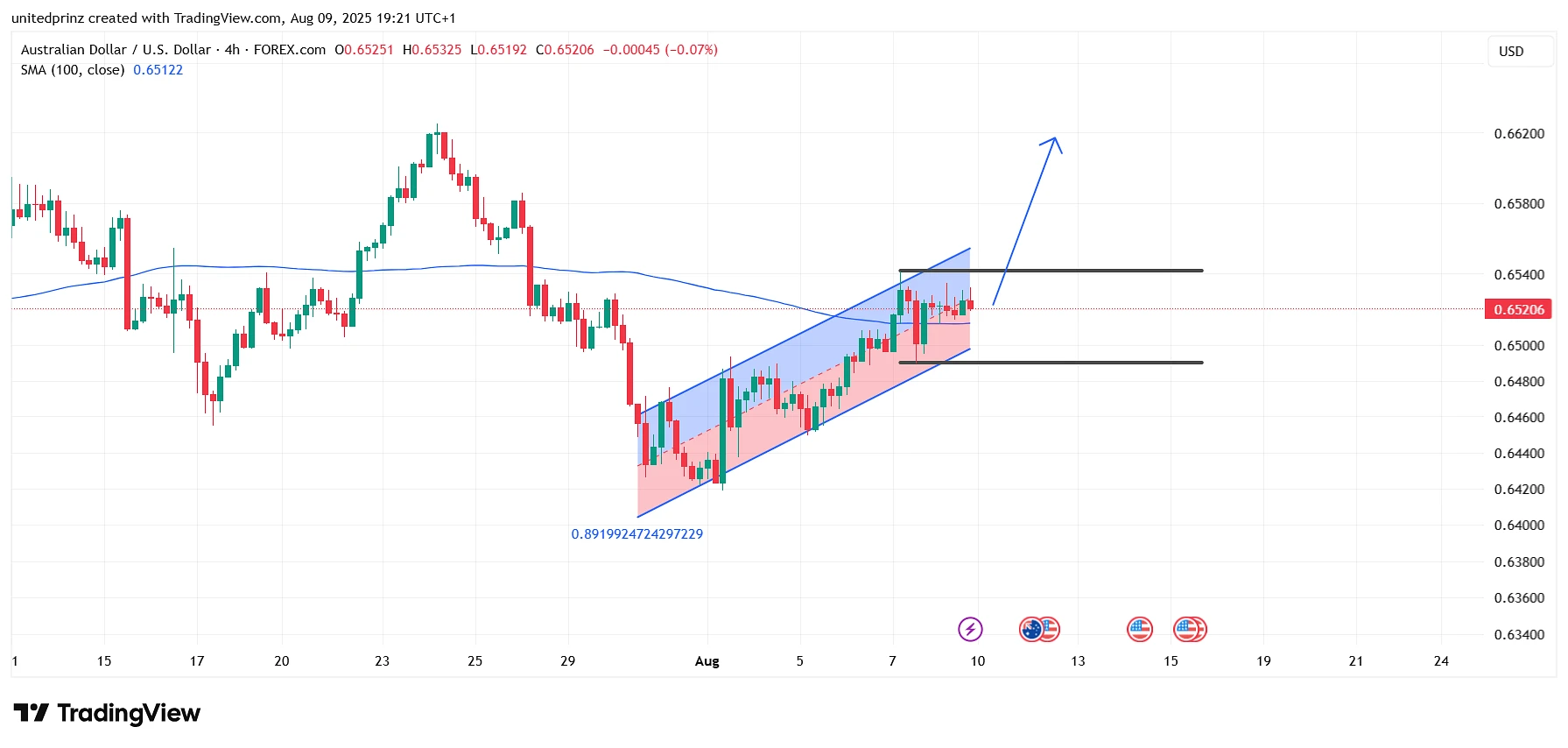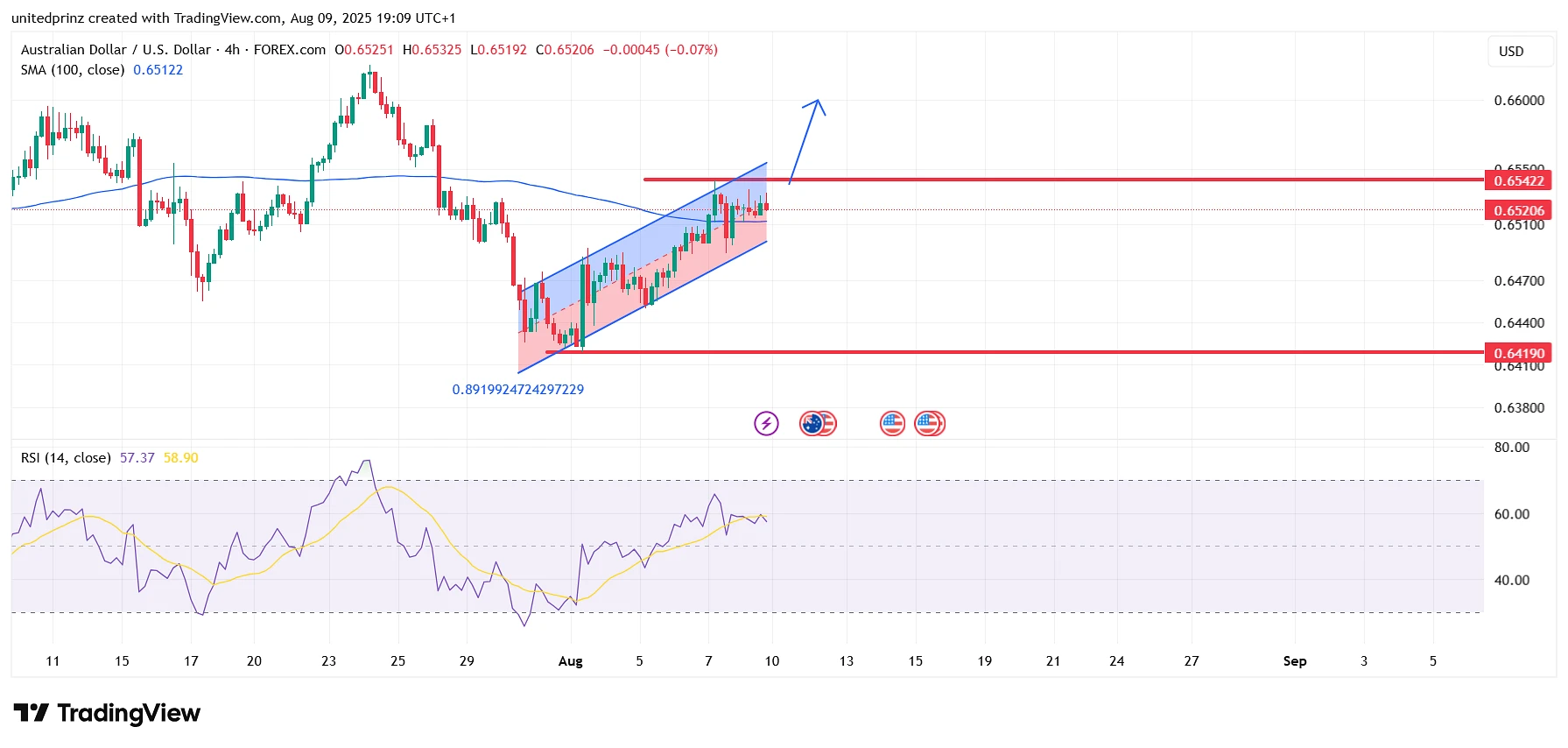 AUD/USD: Currently trading around 0.6522. Key support at 0.6420 (July low), with immediate resistance at 0.6550–0.6570 area. Rising channel from May remains intact with 100-day MA providing dynamic support around 0.6500. Break below 0.6480 could trigger decline toward 0.6420–0.6450 zone. RSI showing bullish momentum but approaching overbought territory.