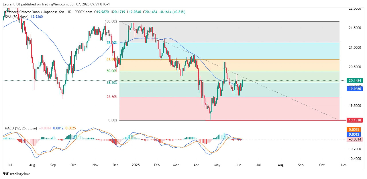 CNH/JPY consolidates near 20.70 (61.8% Fib of 2024 rally). A breakdown below 20.20 (May low) could accelerate losses toward 19.13. MACD lines signal bearish momentum.