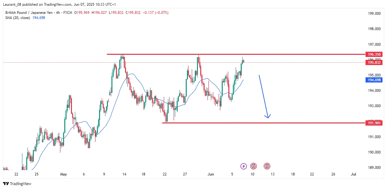 GBP/JPY tests 196.35 resistance. A rejection here could see a pullback to 194.66 (20-day SMA). Volume profile shows weak buying above 196.00.