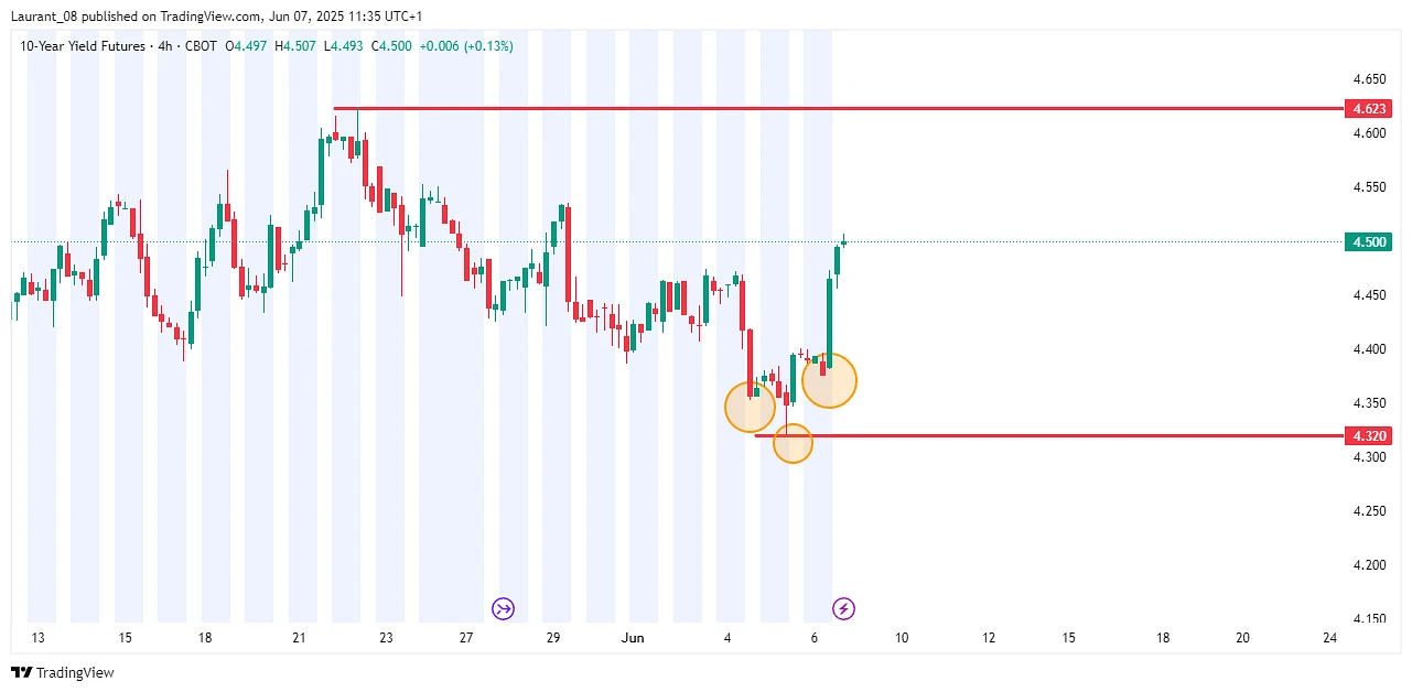 10-Year Treasury Yield breaks above 4.40 resistance. Next target at 4.60 (May high). Inverse head-and-shoulders pattern suggests bullish momentum.