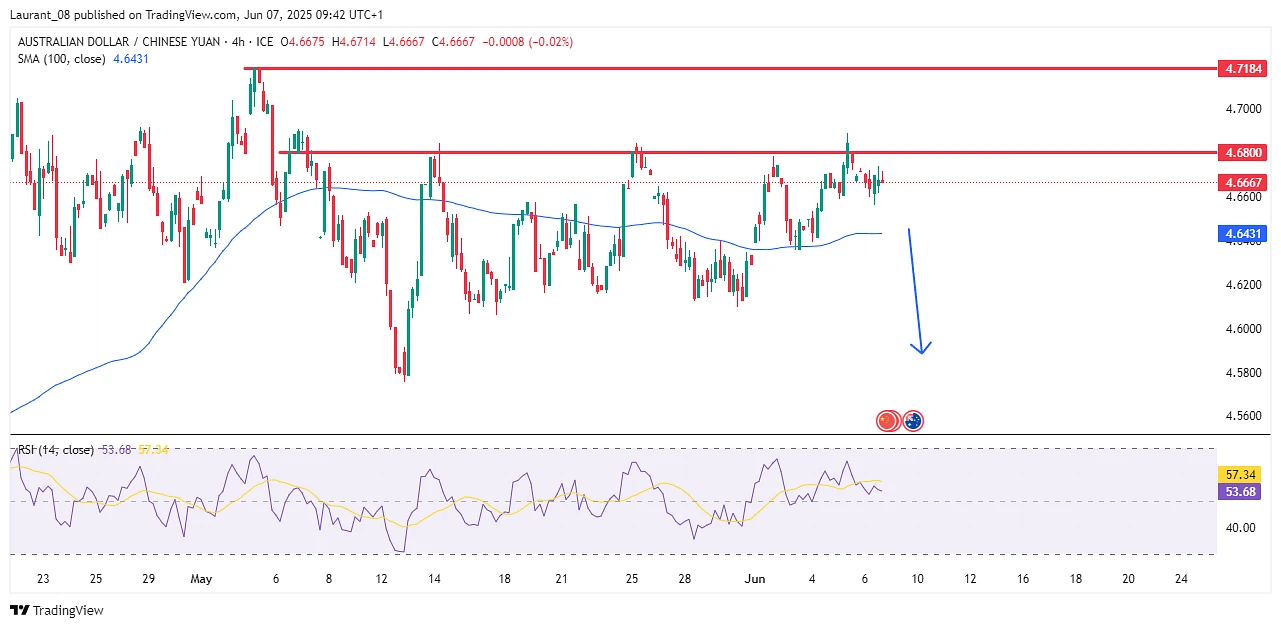 AUD/CNY tests resistance at 4.6800 (May/s high). A daily close above this level could target 4.9200, while failure may revisit 4.6800 support (100-day SMA). RSI divergence signals overbought conditions.