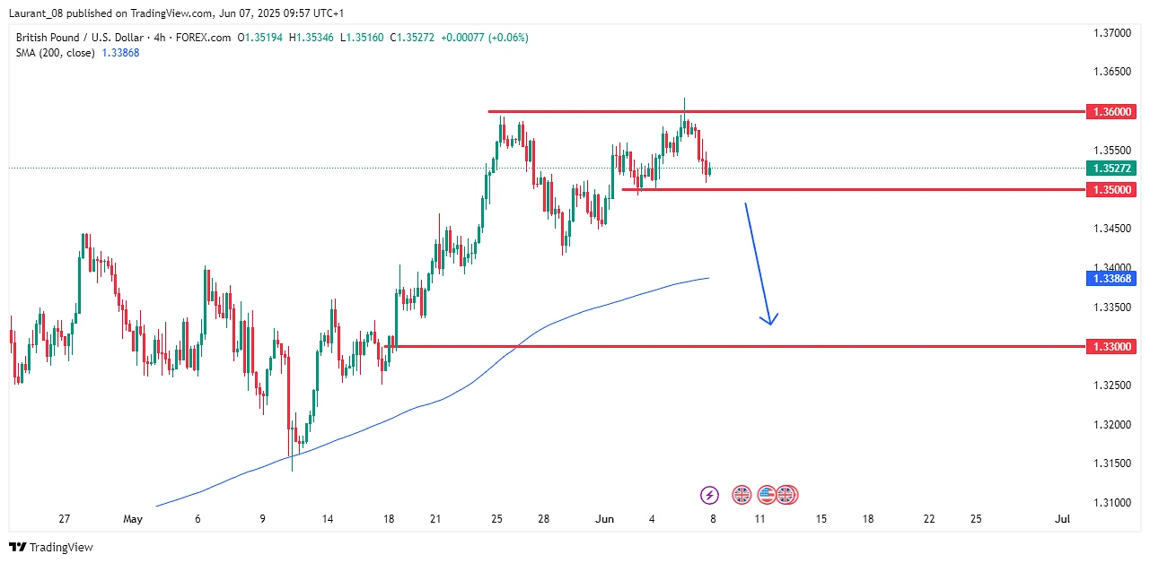 GBP/USD struggles below 1.3600 (YTD high). Immediate support at 1.3500 (May 28 low). A break below 1.3480 (200-day SMA) may trigger a drop to 1.3300.
