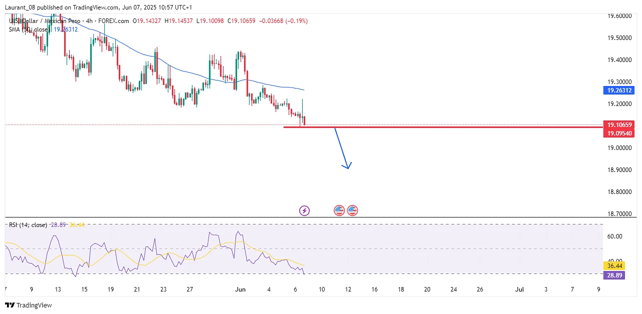USD/MXN breaks below 19.00 support (2025 low). Next target at 18.50 (78.6% Fib). RSI enters oversold territory.