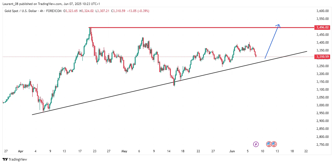 Gold (XAU/USD) tests $3,500 resistance (all-time high). A daily close above this level targets $3,450, while pullbacks find support at $3,275 (trendline).