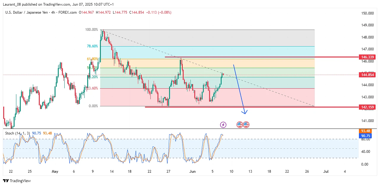 USD/JPY faces resistance at 146.50 (double-top pattern). A close below 145.35 (50% Fib) targets 142.15. Stochastic oscillator shows bearish crossover.