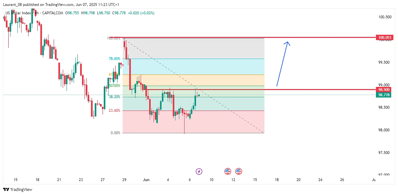 USD Index tests 98.90 resistance (38.2% Fib). A close above 98.80 could target 105.50, while support holds at 98.27 (May low).