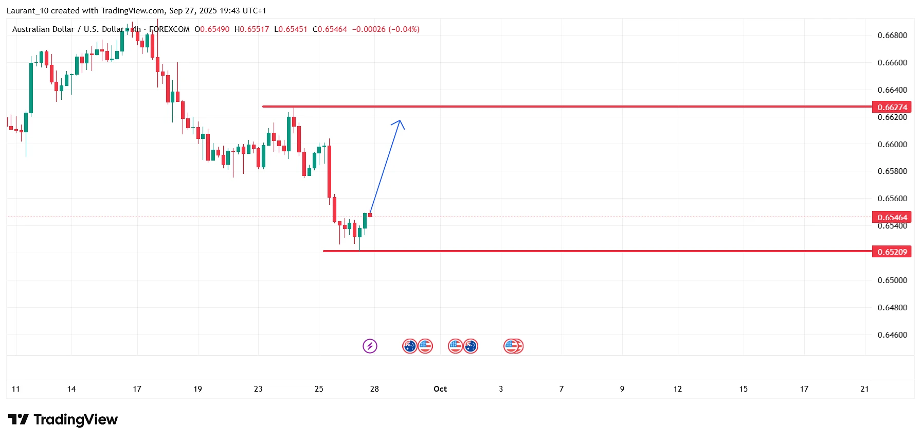 AUD/USD: Kritikus zóna 0.6480–0.6550, havi tartomány 0.6483–0.6707. Héja hangnem áttörheti a 0.6550 ellenállást, galamb hangnem tesztelheti a 0.6450-et.