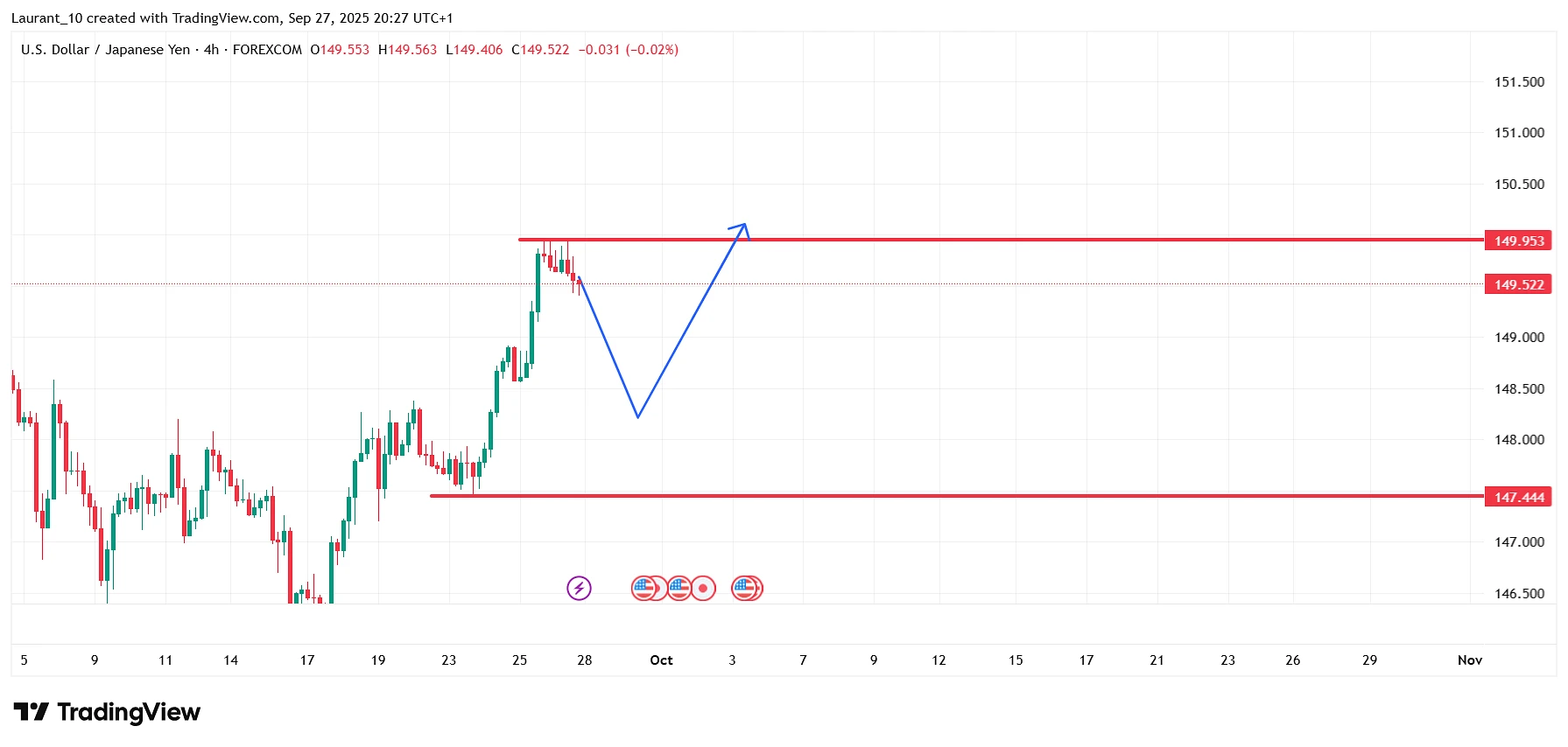 🎯 USD/JPY vétel Services PMI >54,0 esetén (ha az NFP erős volt) 148,40-nél