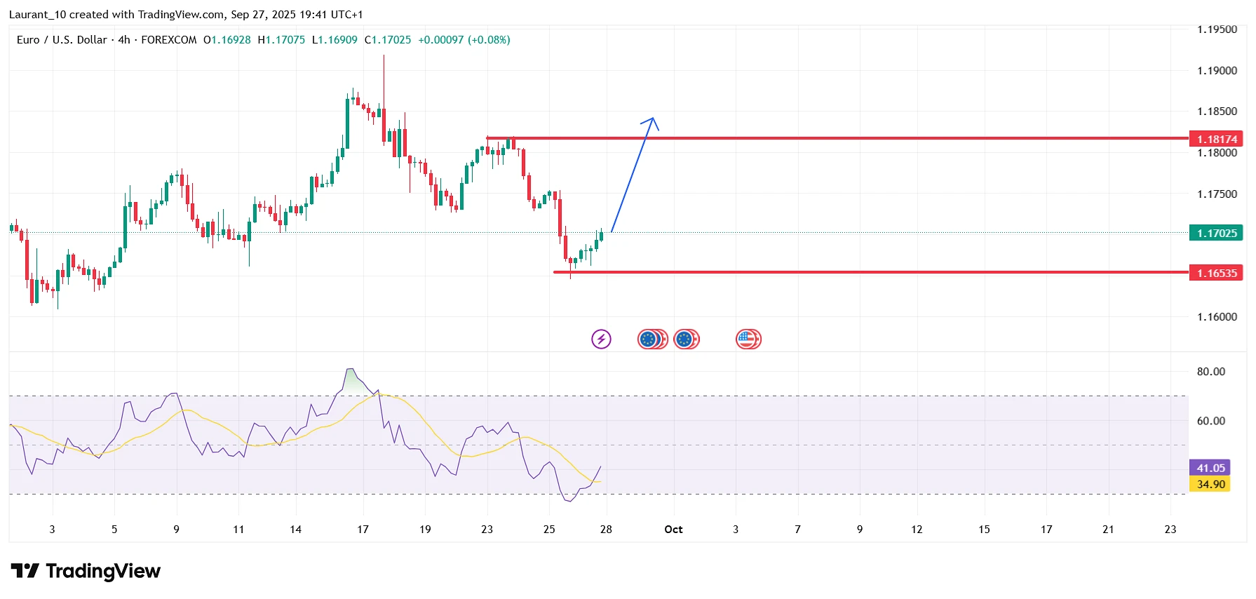 EUR/USD: Konszolidáció 1.1700 körül, kulcsellenállás 1.1750–1.1800. Támasz: 1.1650 (Fibonacci 50%) és 1.1580 (61.8%). Az RSI közel van a túladott szinthez (31), ami teret adhat a visszapattanásnak erős CPI esetén. 1.1720 fölött az árfolyam a 1.1800–1.1820 ellenállási zónát célozhatja.