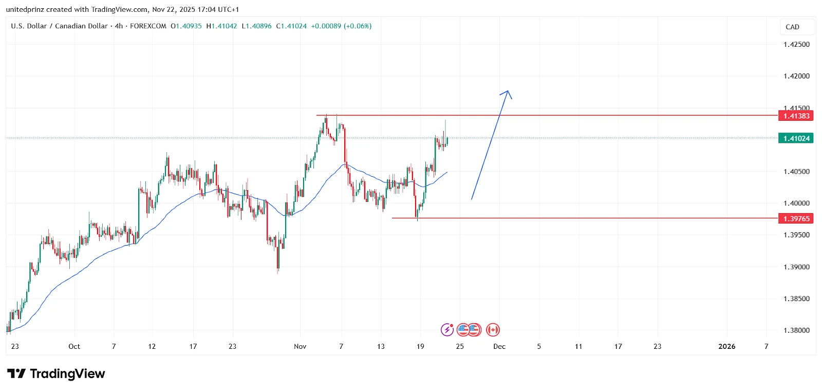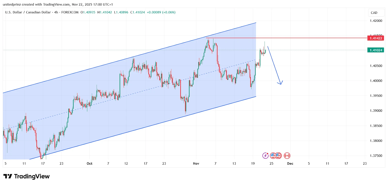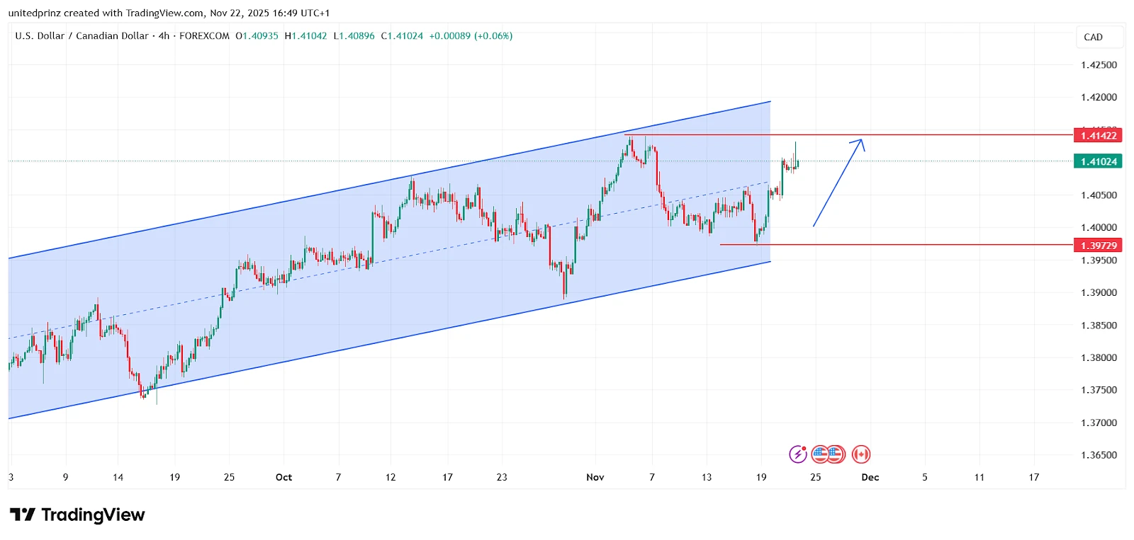USD/CAD: támasz 1,3970–1,4000, ellenállás 1,4090–1,4155. Emelkedő bullish csatornában a 1,4090 közelében.