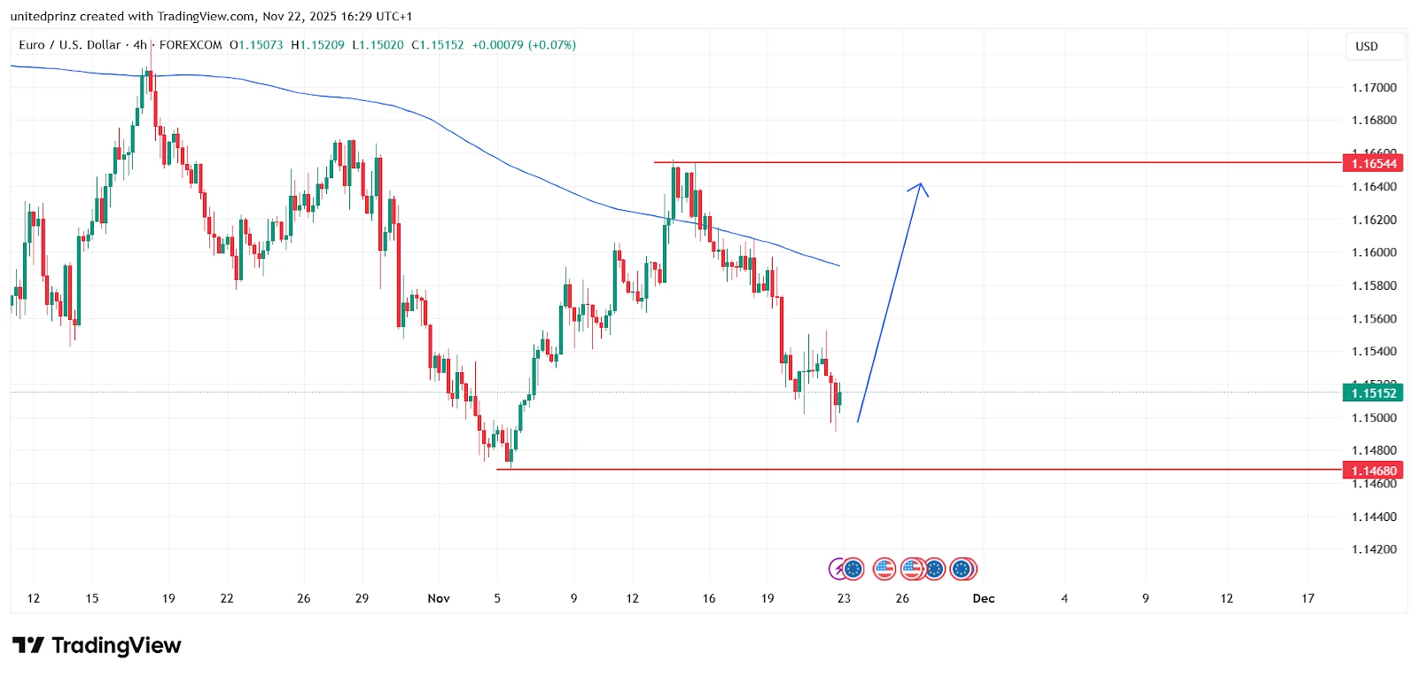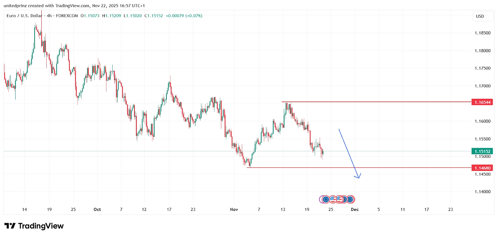 EUR/USD: támasz 1,1495–1,1513 (novemberi mélypontok), ellenállás 1,1590–1,1660. A 200 napos SMA alatt lefelé trendel; áttörés 1,1495 alatt cél 1,1400.
