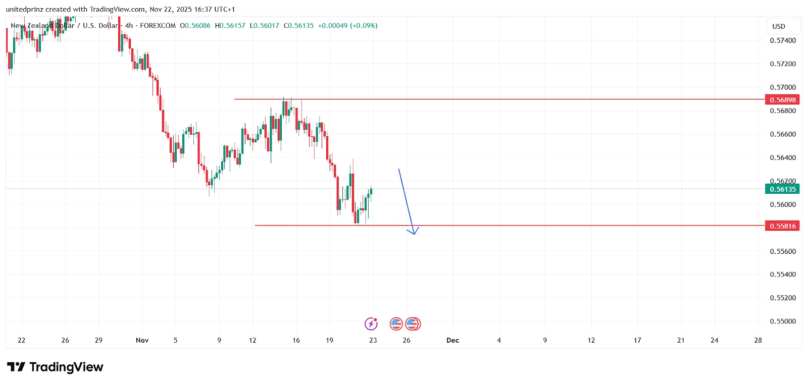 NZD/USD: támasz 0,5565–0,5585, ellenállás 0,5640–0,5660. Túlzottan túladott piac; 0,5565 alatti letörés célja 0,5503–0,5458.