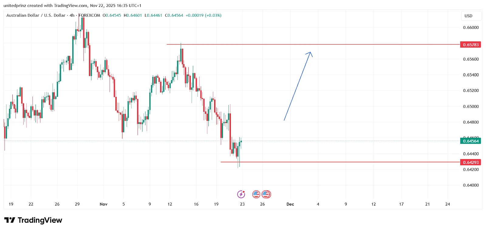 AUD/USD: támasz 0,6445–0,6465, ellenállás 0,6515–0,6535. 0,6445 alatt 0,6300–0,6312 a cél.