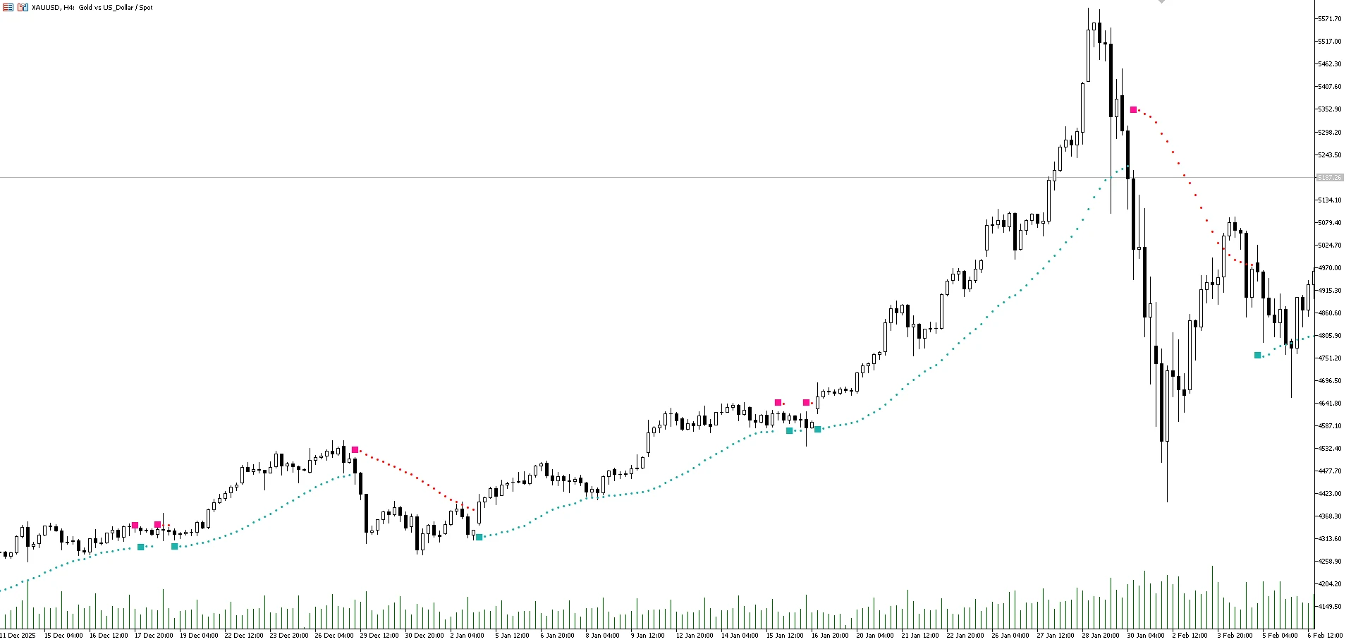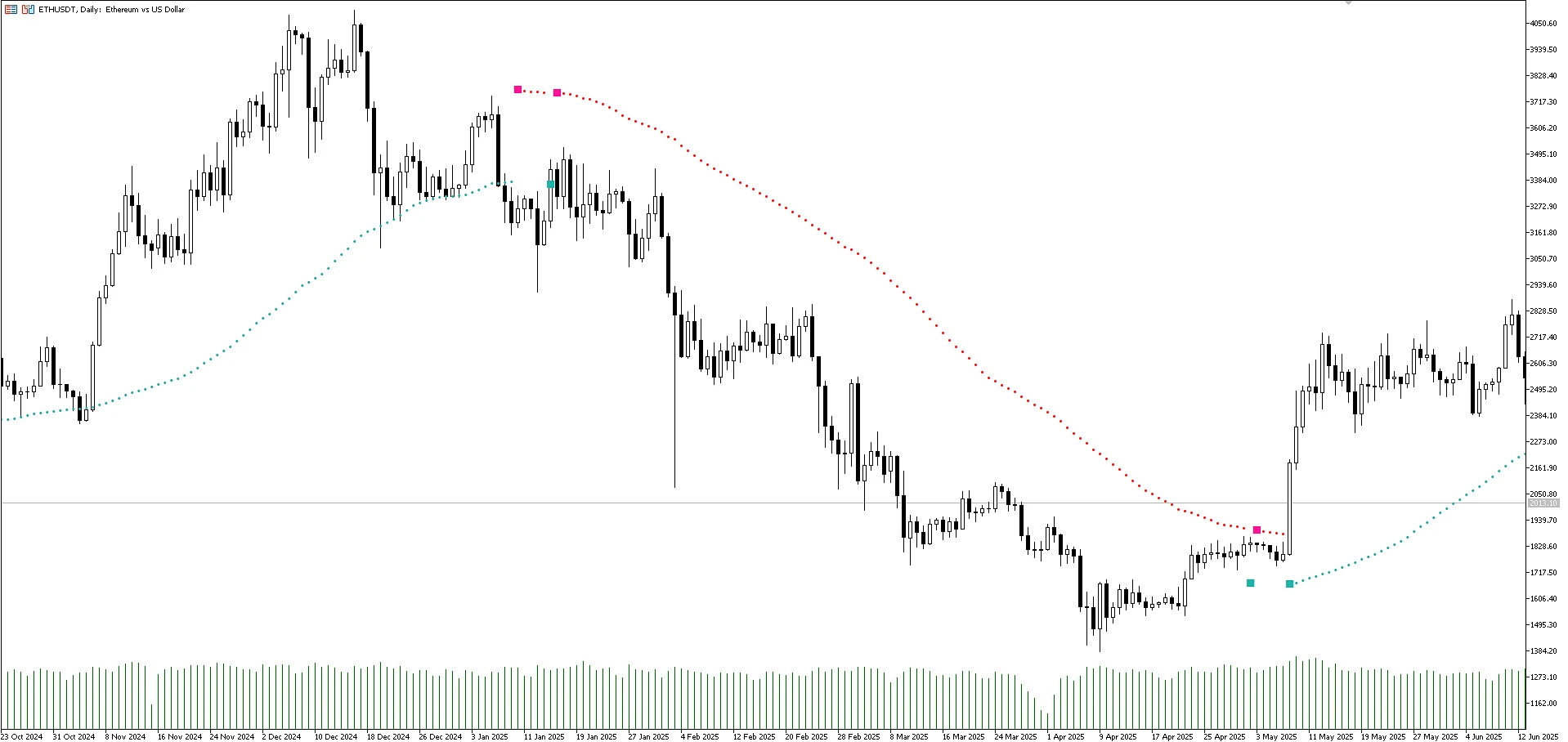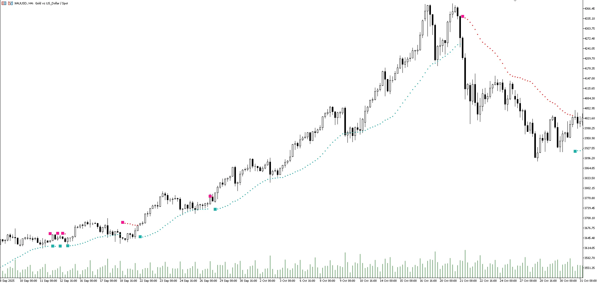 Когда появляется розовый квадрат, это сигнал возможного снижения цены.