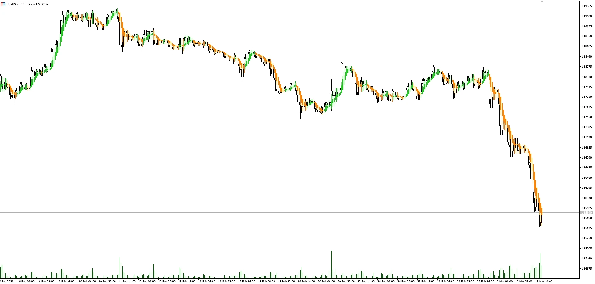 Важно: индикатор не генерирует прямые BUY или SELL сигналы. Он лишь отображает направление текущего тренда с помощью смены цвета баров.